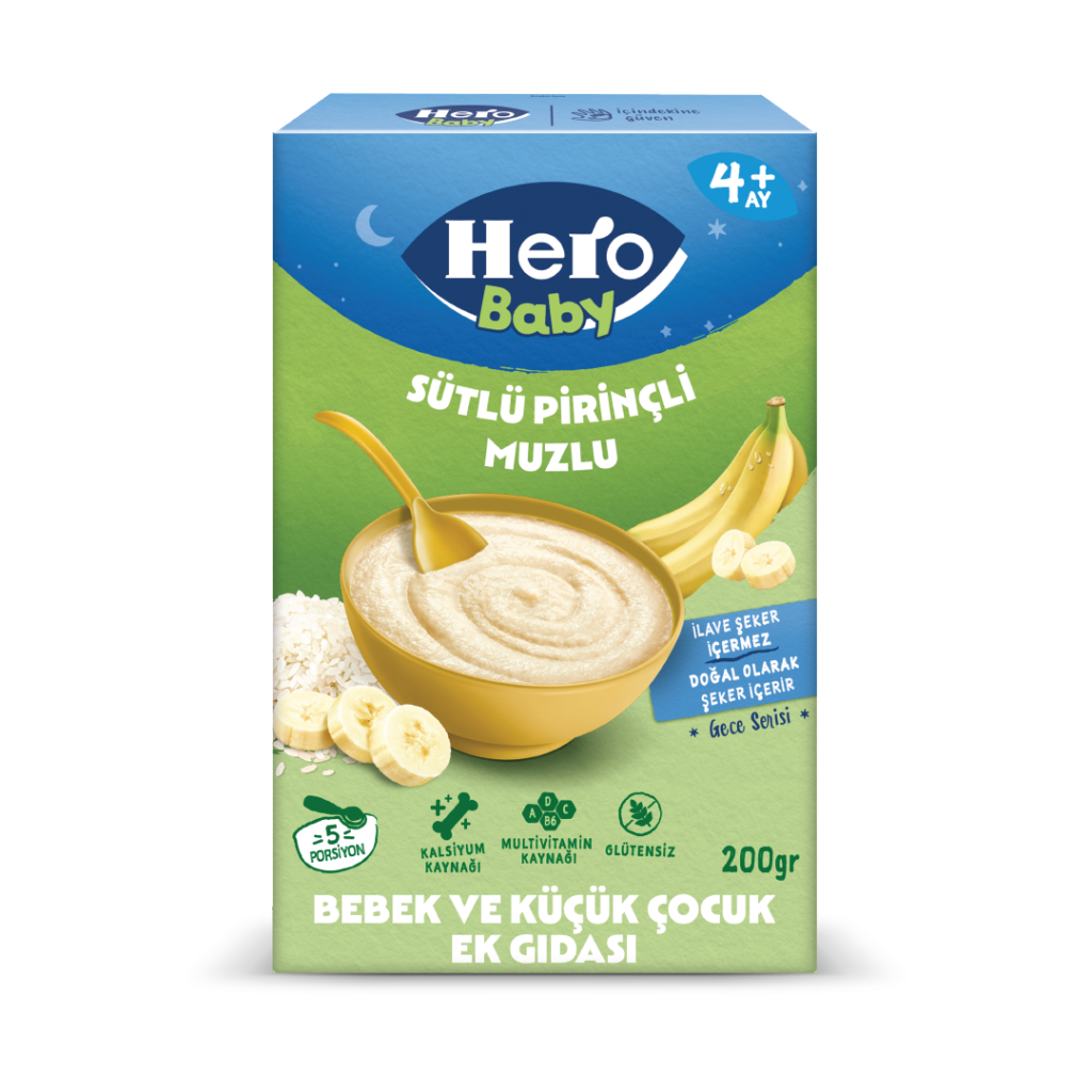 • Bebeğinize uyku öncesi besleyici ve lezzetli bir seçenek aradığınızda Hero Baby Sütlü Pirinçli Muzlu yanınızda.