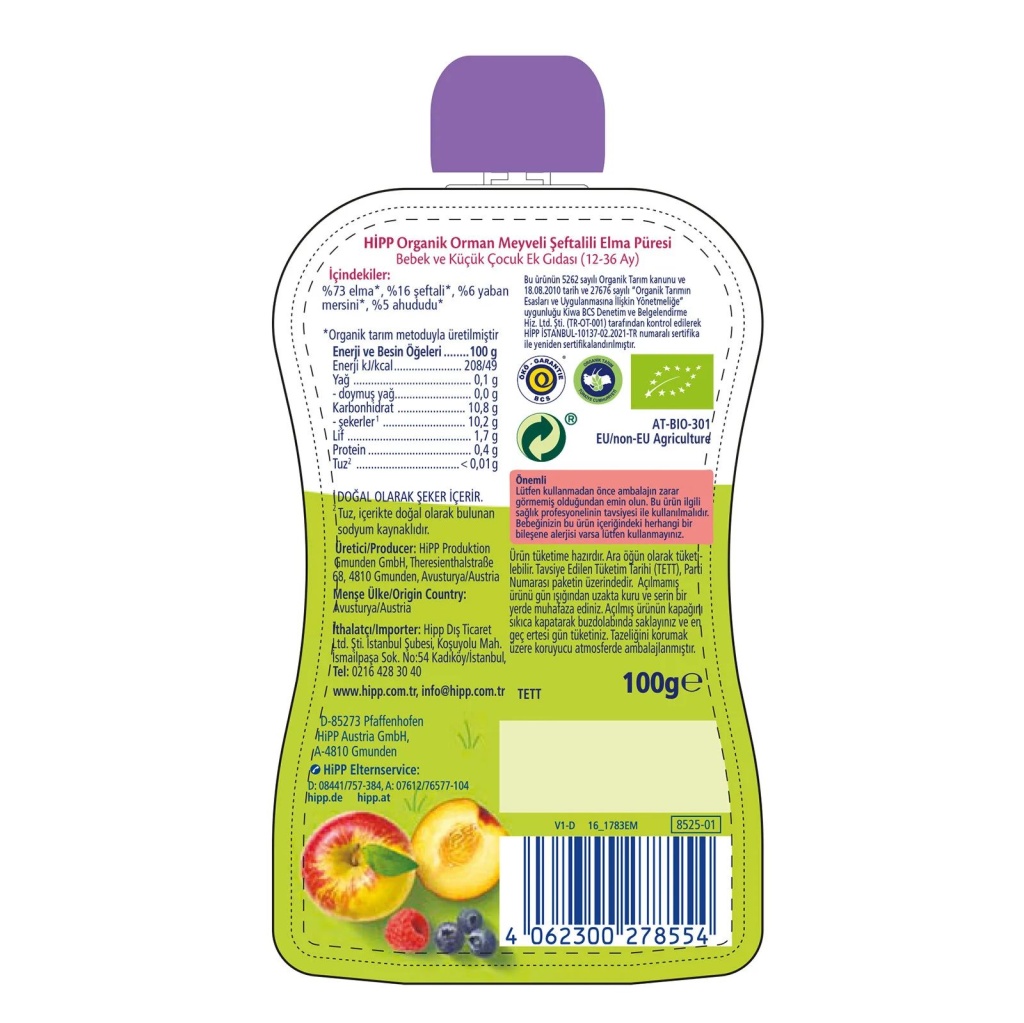 Hipp Organik Orman Meyveli Şeftalili Elma Püresi, ilave şeker içermez.